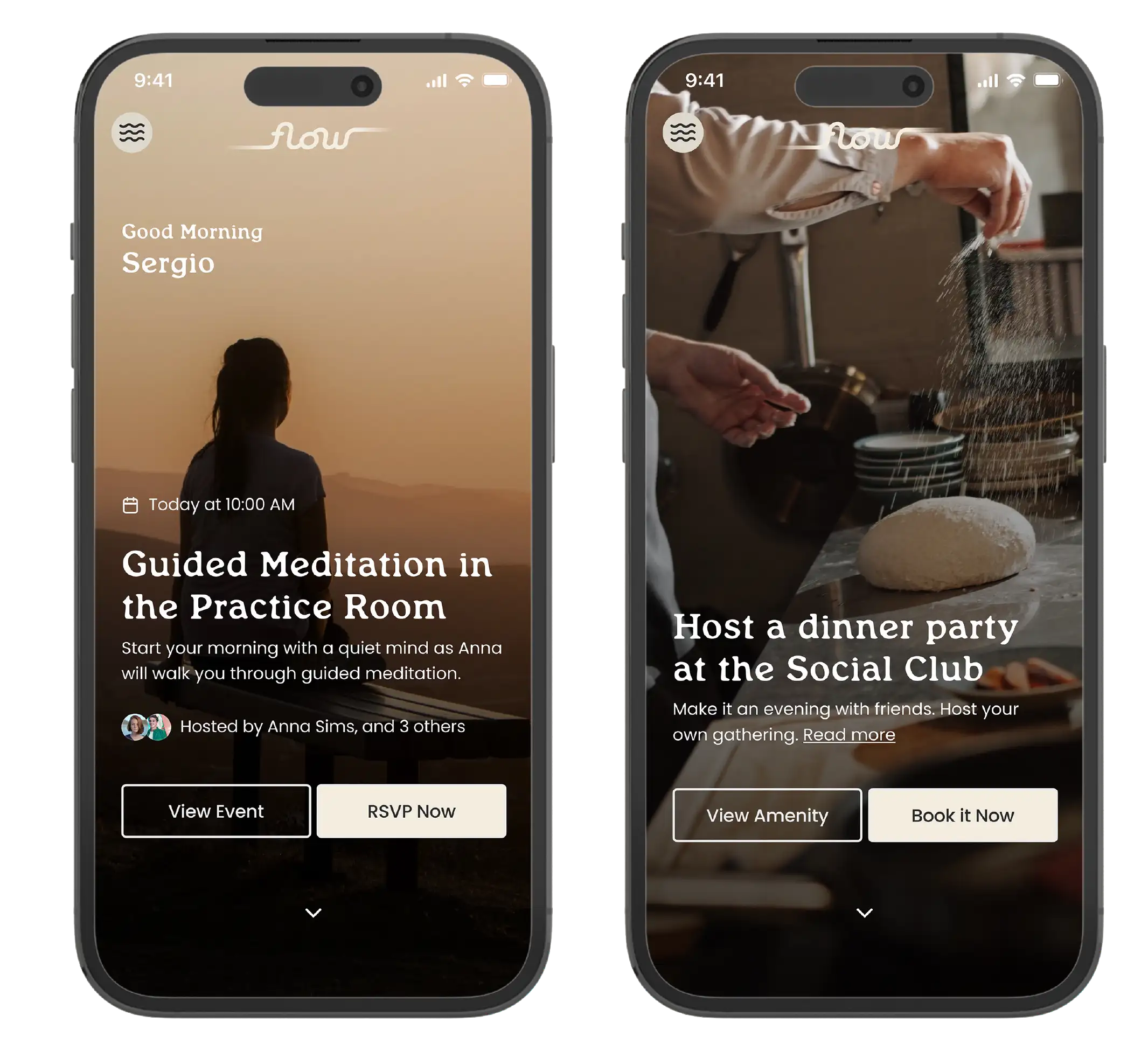 Un ecosistema completo de bienestar, productividad y comunidad: entrenamiento 24/7, yoga/meditación y spa; piscina en azotea; espacios de trabajo con salas privadas y estudio de podcast; agenda social con club, cine y juegos; terrazas con grill y picnic; pet-friendly; todo coordinado desde la Flow App.